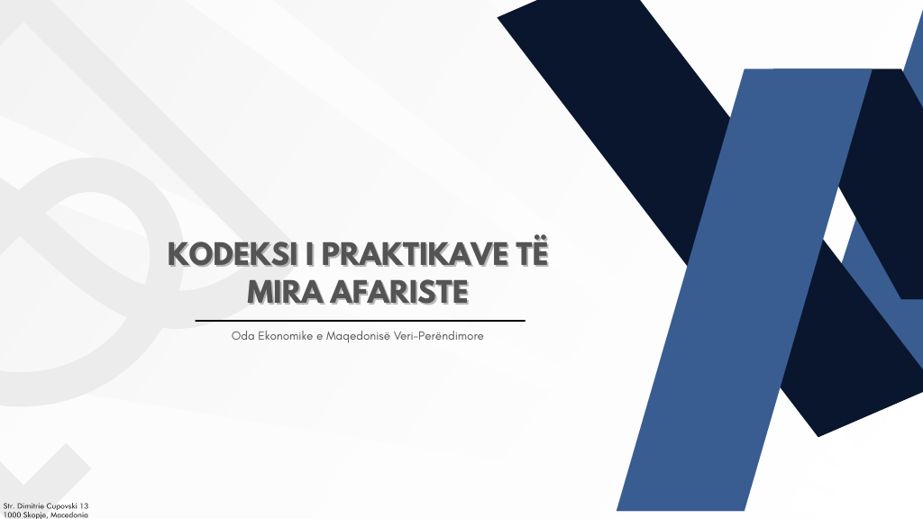 KODEKSI I PRAKTIKAVE TË MIRA AFARISTE është të kontribuojë drejt vendosjes dhe zhvillimit të vlerave dhe praktikave të mira të punës dhe funksionimit në kuadër të subjekteve afariste, anëtare të Odës Ekonomike të Maqedonisë Veri-Perëndimore, rrjedhimisht edhe ngritjes së kapaciteteve organizative të tyre.